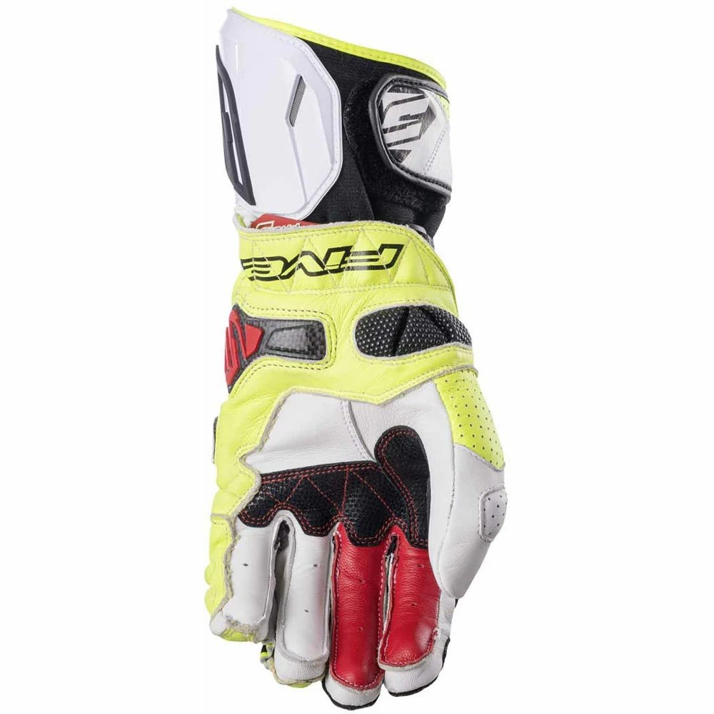 This makes the glove more effective than an ordinary glove in the extreme situation of a long skid where the riderโs hand may be trapped between the road surface and the bike. Protection is maximized by the use of full grain leather, multiple reinforcements with traditional carbon and a Kevlarยฎ lining. The palm features Digital Pittardsยฎ English leather reinforcement for optimal grip in wet conditions. The Velcro adjusting strap is concealed beneath a protective leather flap to reduce the risk of the glove being torn off in the event of a fall. The greatest attention has been paid to steering precision and comfort. RFX RACE: This is the glove designed and used by official FIVE riders in MotoGP, SBK and Endurance World Championships.